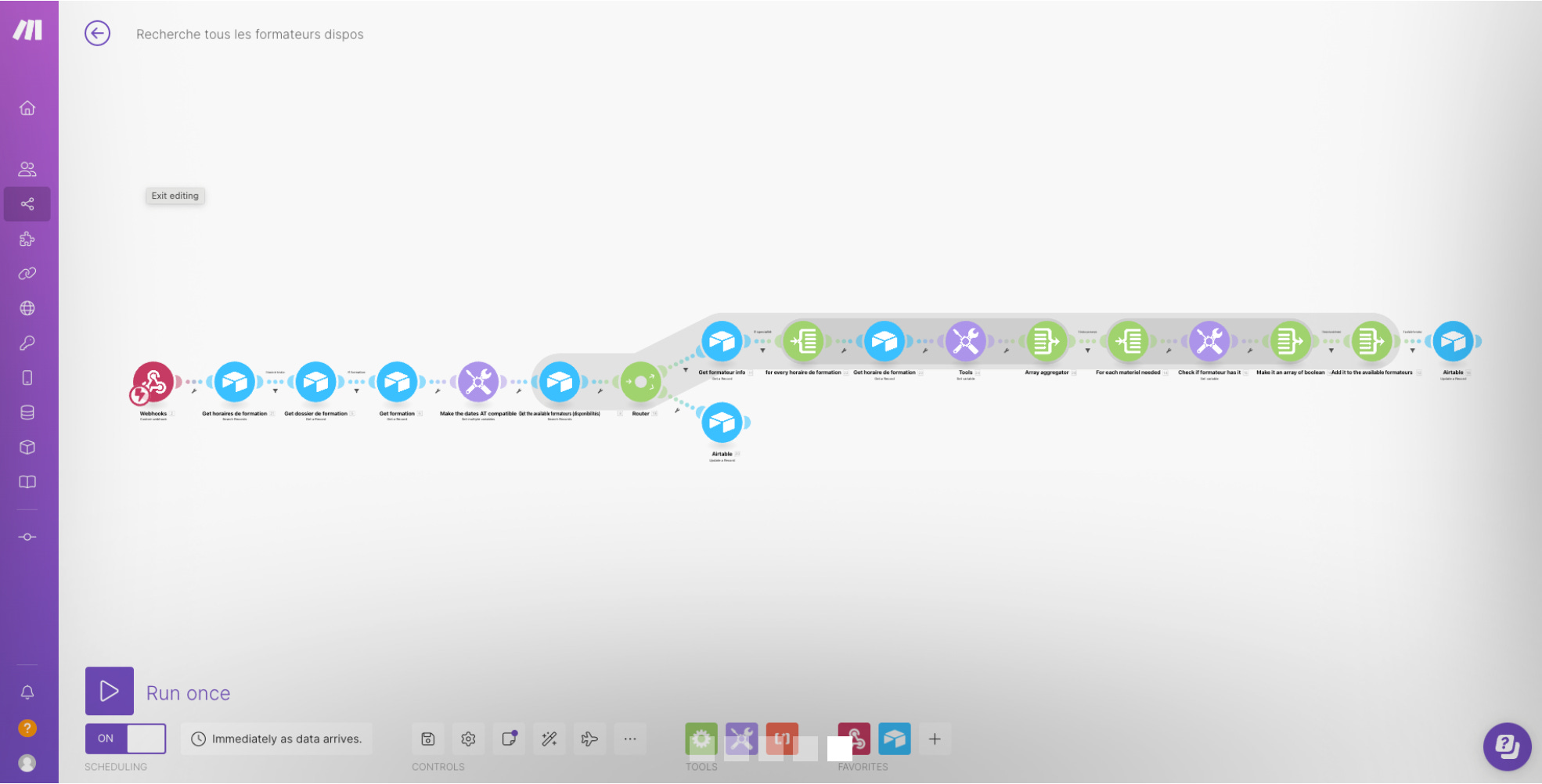 GrĂące Ă Make, on a dĂ©veloppĂ© un algorithme de matching sur mesure qui assigne automatiquement les formateurs disponibles aux formations. đ€ L'algorithme prend en compte une variĂ©tĂ© de critĂšres, y compris la spĂ©cialitĂ© enseignĂ©e, le matĂ©riel requis et la localisation. Et en plus, Ă©videmment, Make a Ă©tĂ© utilisĂ© pour automatiser la gĂ©nĂ©ration de tous les documents nĂ©cessaires, rĂ©duisant ainsi la paperasse fastidieuse.